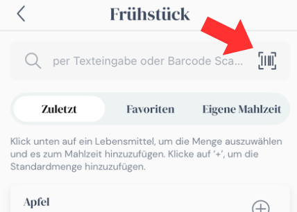 2. Klick auf den Barcode oben rechts in der Suchleiste, um zur Lebensmittelsuche zu gelangen.