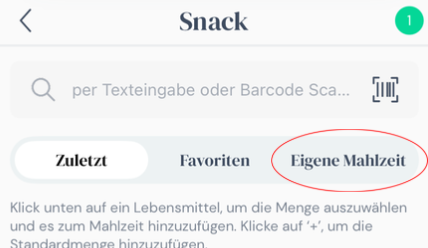 - Du bist in der Funktion Tagebuch und gehst auf "Mahlzeit erstellen". Dort wechselst du in den Reiter eigene Mahlzeit.